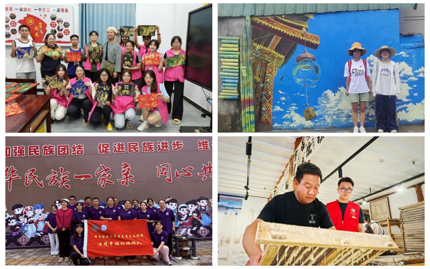 聚焦非遗保护,联动地方政府、文化机构、非遗传承人,开展“非遗活态传承”行动。理学院“特色民族·情系家乡”实践队深入西双版纳哈尼族、傣族聚居村落,开展少数民族文化调研与中华民族共同体意识实践活动,参加哈尼族非遗传承人二艳的非遗技艺体验课堂,对滇绗草博物馆阿卡然说三、傣族章哈玉叫、召诣傣院玉康坎等传承人开展专题采访,参加非遗工坊实践,系统学习哈尼族、傣族非遗技艺、文化习俗及背后的精神内核,并通过制作短视频、撰写公众号等,宣传“中华民族一家亲”的理念。园林园艺学院“彩墨凝边·乡境共织”实践团在孟定镇下坝社区派卡组参与派卡组村容村貌整治工作,围绕“民族交融、边疆发展”主题,通过实施“墙绘创作”和“乡村闲置资源利用”,传播民族文化,让乡土韵味与民族特色在环境改造中深度融合。建筑工程学院“彩画寻踪:丽江古建筑文化保护”实践队到丽江市古城区调研古建筑彩画,开展彩画历史与保护知识科普讲座;完成纳西传统民居建筑测绘,记录丽江彩画的纹样体系、色彩配置与工艺特征,完成至少10处典型建筑构件的详细数据采集,拍摄彩画细节照片1200余张,建立典型彩画纹样与色彩数据库,填补了滇西北多民族地区彩画系统研究空白,为建筑彩画史和民族艺术研究提供重要案例。动物医学院“云岭千峒·共牧兴邦”实践团参观德宏州博物馆,深入了解景颇族“目瑙纵歌”、傈僳族“阔时节”等民族文化的深厚内涵,通过视频资料、实物展陈与场景复原,沉浸式体验多民族交融的历史与现实,深化了对祖国边疆民族地区文化多样性的理解。马克思主义学院“福籽·怒江同心”边疆实践团聚焦怒江傈僳族自治州泸水市边境幸福村,通过实地考察、访谈、问卷调查等多种方式,深入了解幸福村在特色农业发展、民风民俗传承、乡村治理等方面的现状与挑战,总结经验,发现问题,为推动边境地区民族团结进步和乡村振兴提供参考依据。